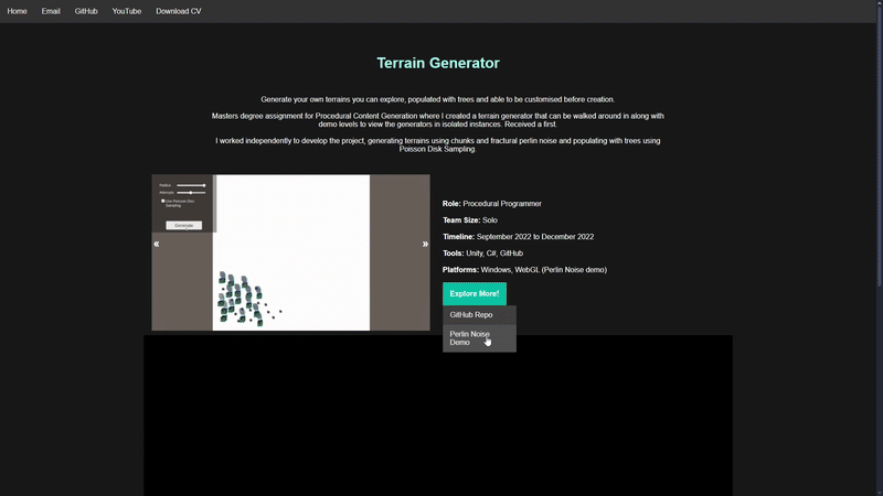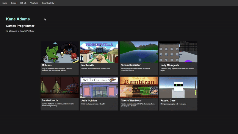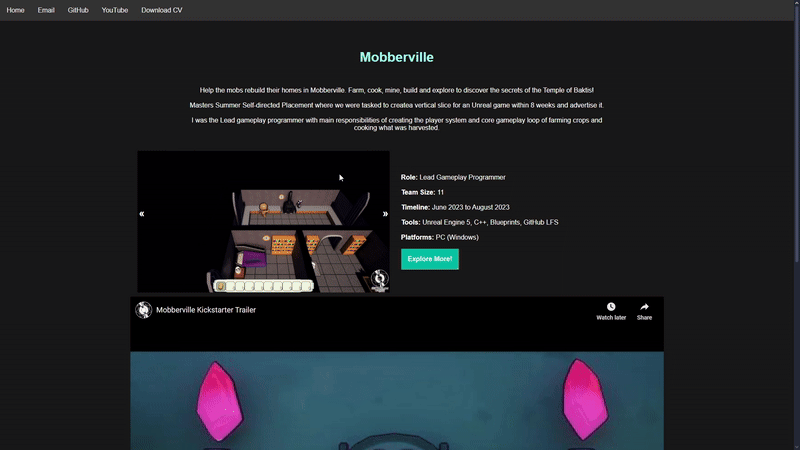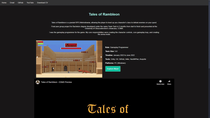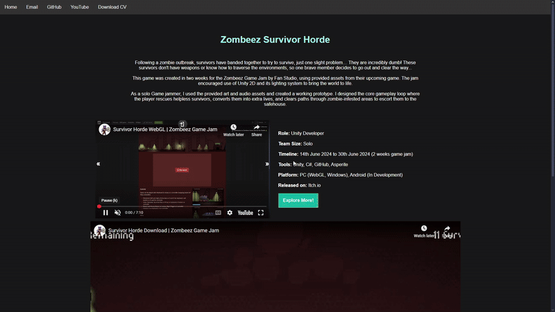 This portfolio site was created to showcase my work, projects, and CV in a clean, accessible way. It features project pages with slideshows, gameplay videos, and playable WebGL demos.